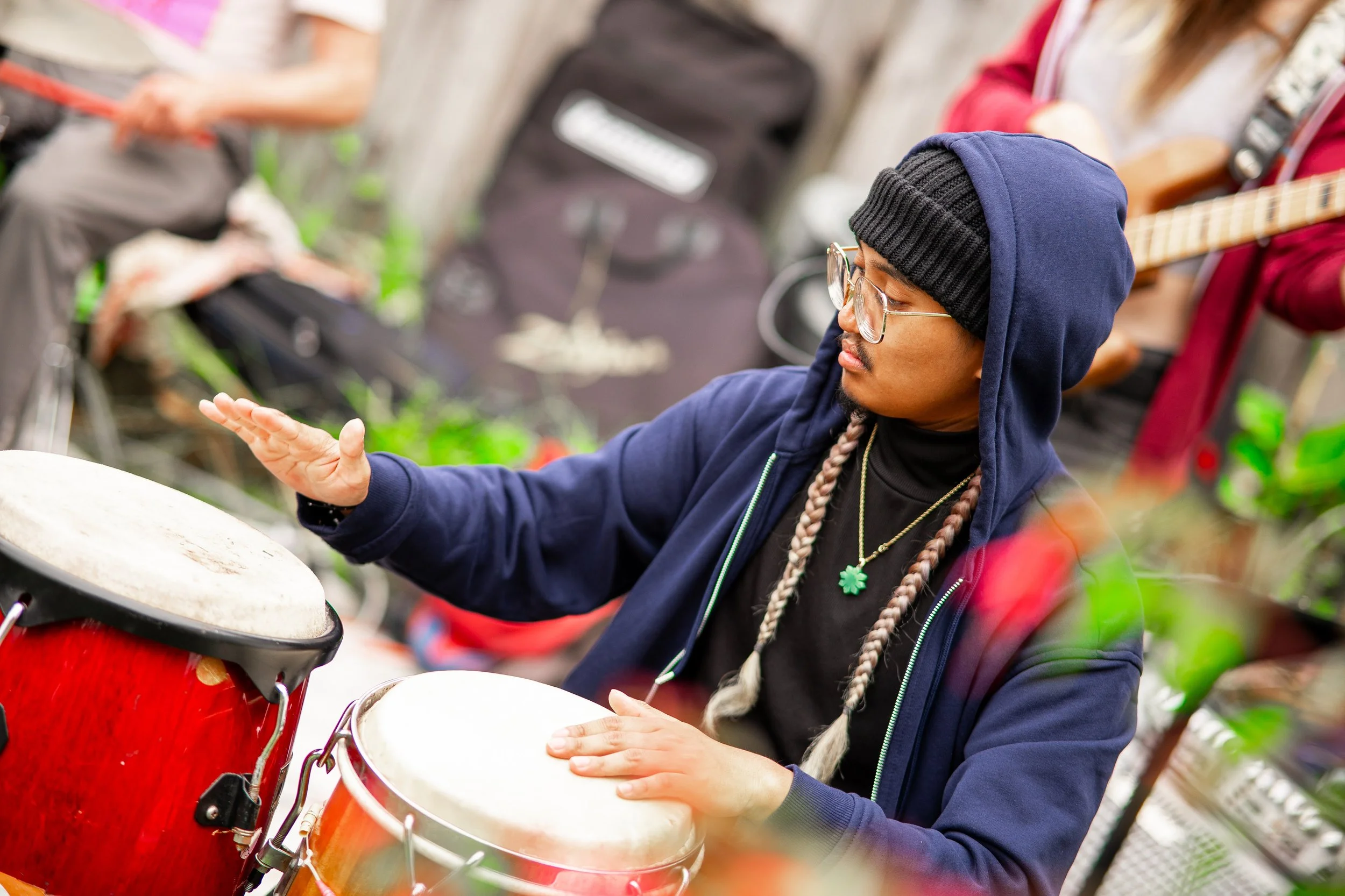 Each tune tells a story that spans continents and centuries: a cumbia from Colombia, a Wassoulou groove from Mali, a polymetric dance from the Congo, a Hindu rhythm from South India—all transformed through the band’s collective energy. DrClock, a Juilliard-trained percussionist and composer with decades of experience performing with artists like Ray Charles, Yo-Yo Ma, Lenard Bernstein, and Ella Fitzgerald, is at the ensemble's heart. His compositions are the band’s backbone: rich with history, bold in form, and built to move.
